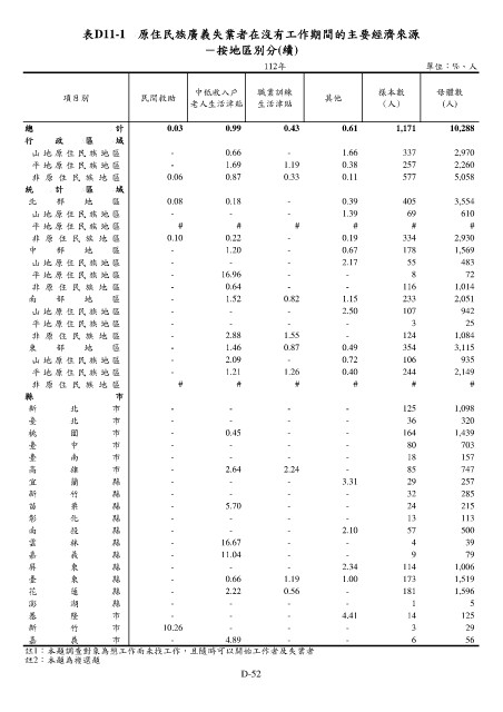 表D11-1 原住民族廣義失業者在沒有工作期間的主要經濟來源