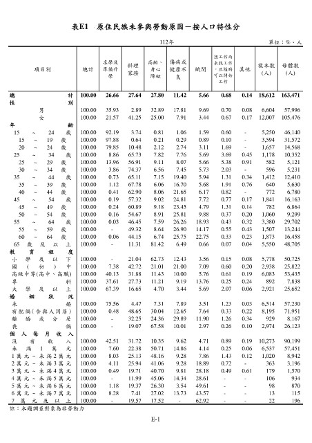 表E1 原住民族未參與勞動原因-按人口特性分