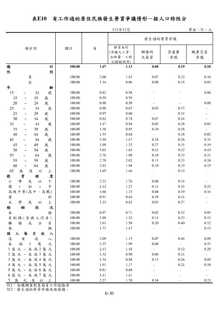 表E10 有工作過的原住民族發生勞資爭議情形-按人口特性分
