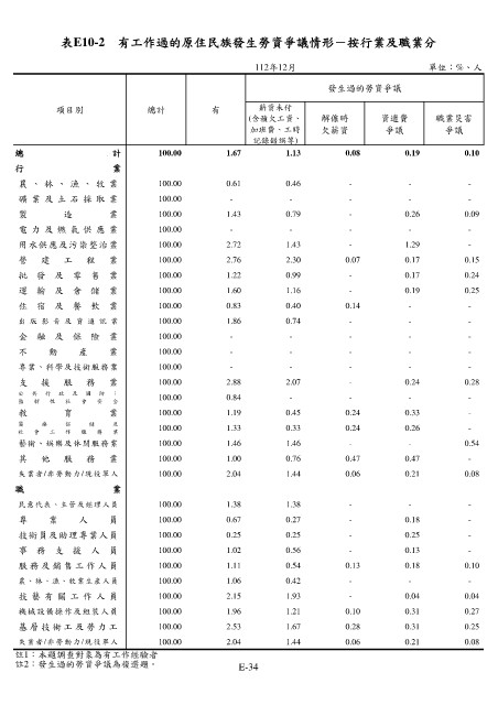 表E10-2 有工作過的原住民族發生勞資爭議情形-按行業及職業分