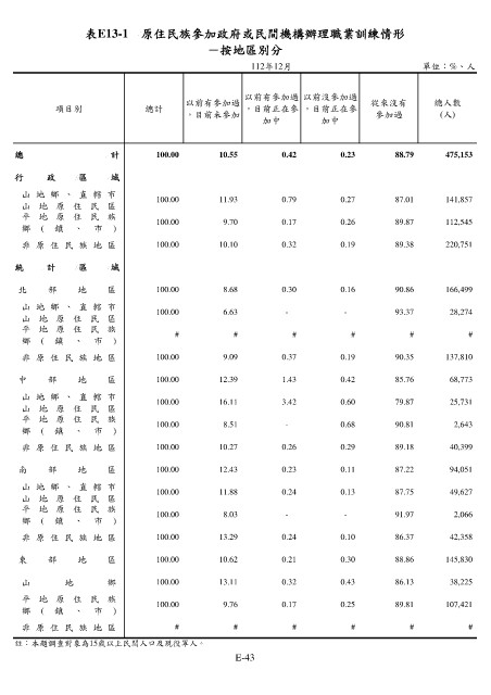 表E13-1 原住民族參加政府或民間機構辦理職業訓練情形