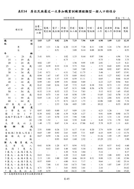 表E14 原住民族最近一次參加職業訓練課程類型-按人口特性分