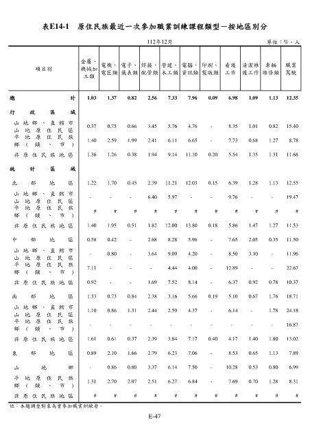 表E14-1 原住民族最近一次參加職業訓練課程類型-按地區別分