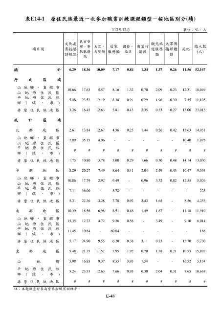 表E14-1 原住民族最近一次參加職業訓練課程類型-按地區別分(續)