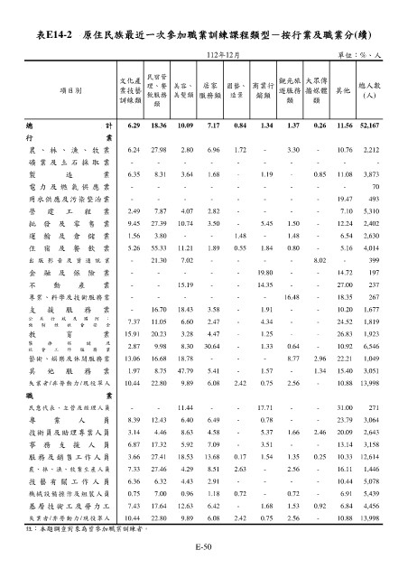 表E14-2 原住民族最近一次參加職業訓練課程類型-按行業及職業分(續)