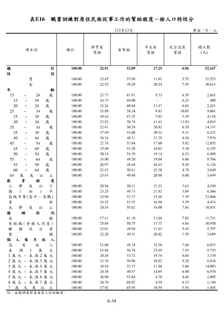 表E16 職業訓練對原住民族從事工作的幫助程度-按人口特性分