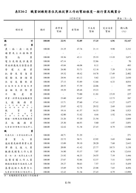 表E16-2 職業訓練對原住民族從事工作的幫助程度-按行業及職業分