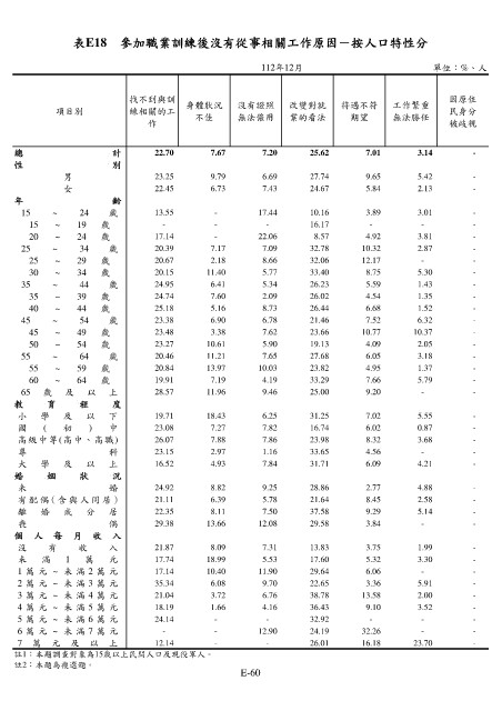 表E18 參加職業訓練後沒有從事相關工作原因-按人口特性分
