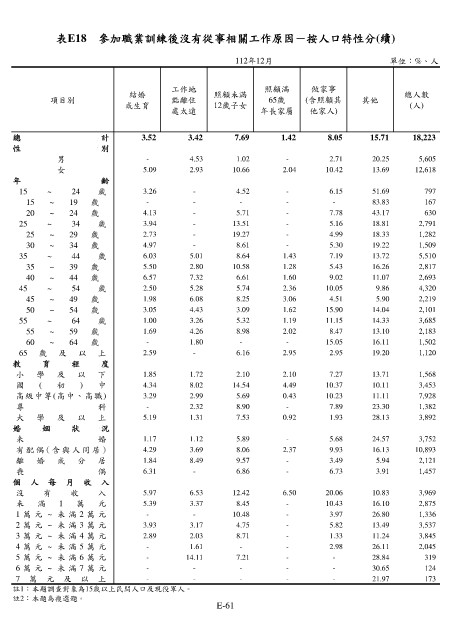 表E18 參加職業訓練後沒有從事相關工作原因-按人口特性分(續)