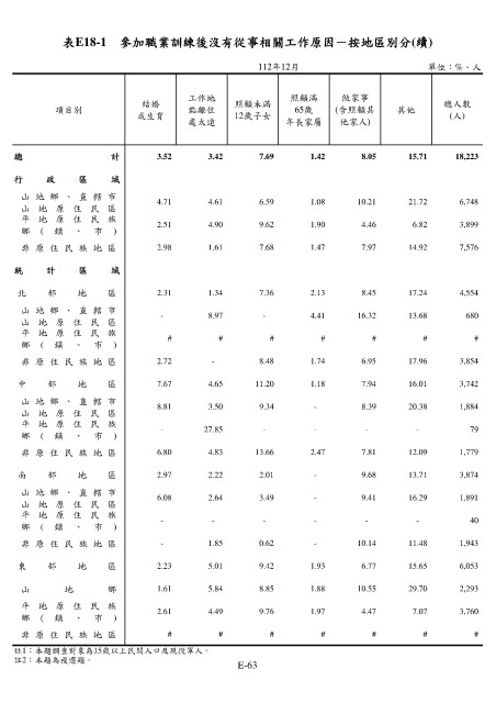表E18-1 參加職業訓練後沒有從事相關工作原因-按地區別分(續)