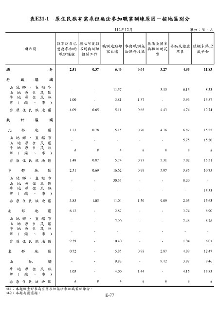 表E21-1 原住民族有需求但無法參加職業訓練原因-按地區別分