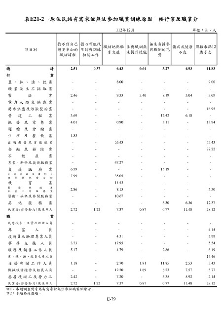 表E21-2 原住民族有需求但無法參加職業訓練原因-按行業及職業分