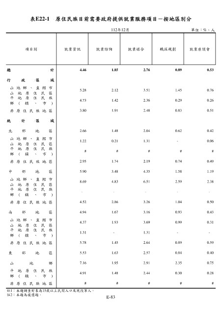 表E22-1 原住民族目前需要政府提供就業服務項目-按地區別分