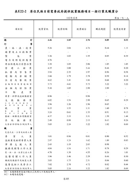 表E22-2 原住民族目前需要政府提供就業服務項目-按行業及職業分