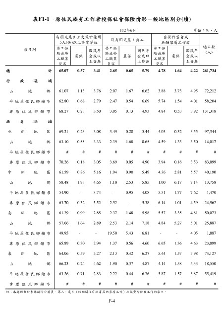 表F1-1 原住民族有工作者投保社會保險情形-按地區別分(續)