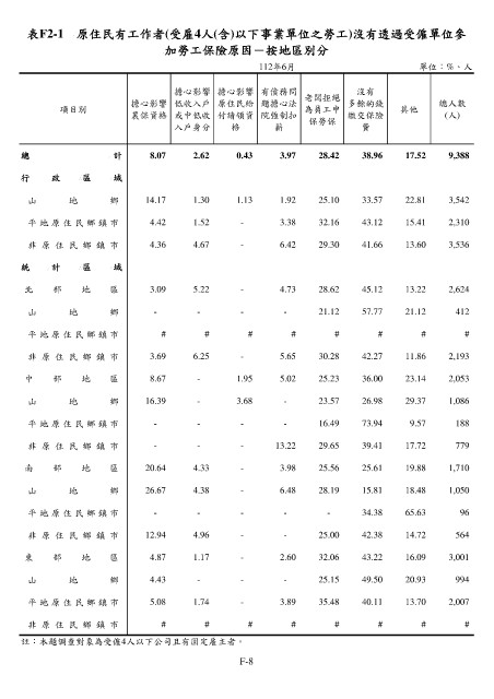表F2-1 原住民有工作者(受雇4人(含)以下事業單位之勞工)沒有透過受僱單位參