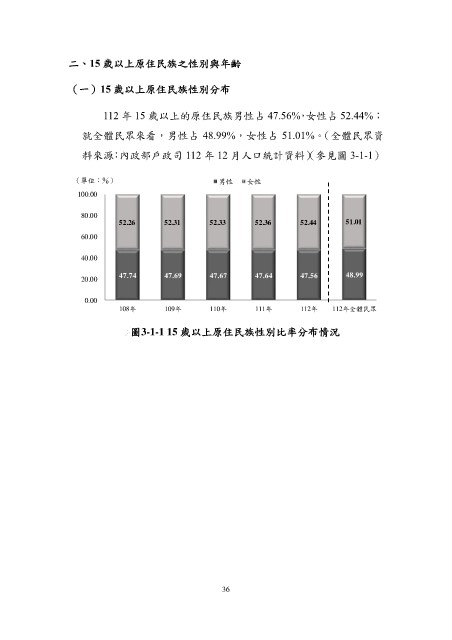 112 年 15 歲以上的原住民族男性占 47.56%,女性占 52.44%;