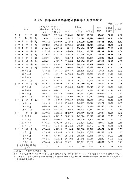 3. 110 年 6 月原住民族就業狀況調查受嚴重特殊傳染性肺炎(COVID-19)影響暫停辦理,故 110 年平均為該年 3