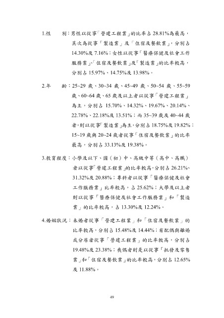 1.性 別:男性以從事「營建工程業」的比率占 28.81%為最高,