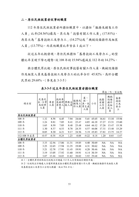 從近五年比較發現,原住民族擔任「基層技術工及勞力工」的整