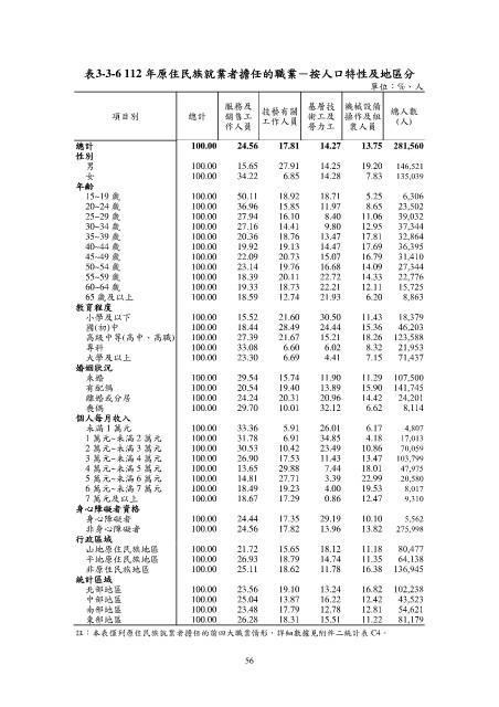 表3-3-6 112 年原住民族就業者擔任的職業-按人口特性及地區分