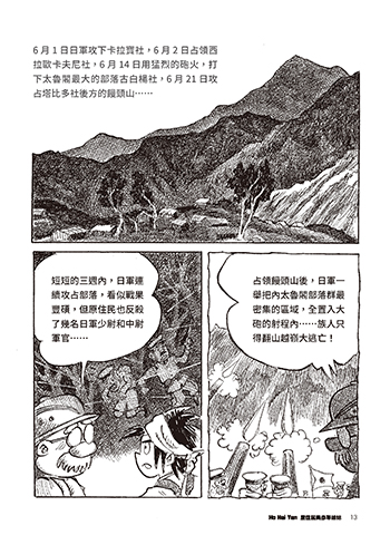 6 月 1 日日軍攻下卡拉寶社,6 月 2 日占領西 拉歐卡夫尼社,6 月 14 日用猛烈的砲火,打 下太魯閣最大的部落古白楊社,6 月 21 日攻 占塔比多社後方的饅頭山…… 短短的三週內,日軍連 占領饅頭山後,日軍一 續攻占部落,看似戰果 舉把內太魯閣部落群最 豐碩,但原住民也反殺 密集的區域,全置入大 了幾名日軍少尉和中尉 砲的射程內……族人只 軍官…… 得翻山越嶺大逃亡! 13 ဘ༑ዝ̦ JOEE ဘ༑ዝ̦ JOEE