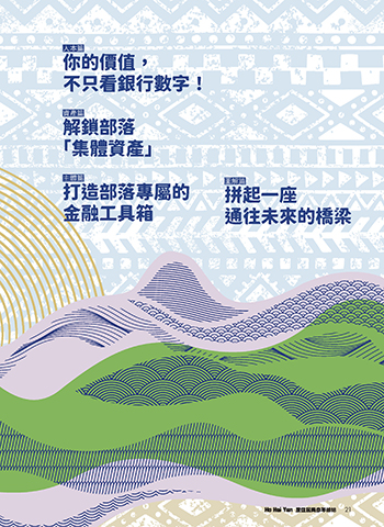 人本篇 你的價值, 不只看銀行數字! 資產篇 解鎖部落 「集體資產」 主體篇 圖解篇 打造部落專屬的 拼起一座 金融工具箱 通往未來的橋梁 21 ܆݂ࠦԫ JOEE ܆݂ࠦԫ JOEE