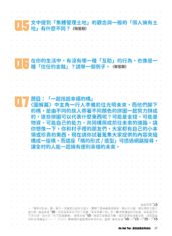 37 Q7_ 自由發揮 之間互相借文具、幫忙收作業、或社區裡舉辦愛心義賣,大家互相信任與幫助,也是一種「信任的金融」。 地怎麼使用,重視共同照顧與永續;而「個人擁有土地」是個人自己決定使用方式。Q6_ 參考答案 : 像同學 學習理財、提供貸款與創業支援,讓社區能自立發展。Q5_ 參考答案 :「集體管理土地」是大家一起決定土 Q1_C。Q2_A。Q3_B。Q4_ 參考答案 : 美國「原住民族社區發展金融機構(CDFIs)」——它是幫助原住民