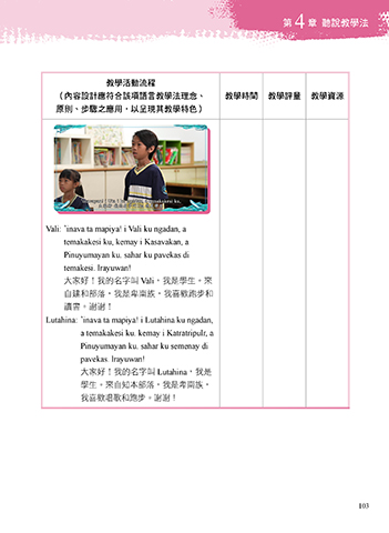 (內容設計應符合該項語言教學法理念、 教學時間 教學評量 教學資源