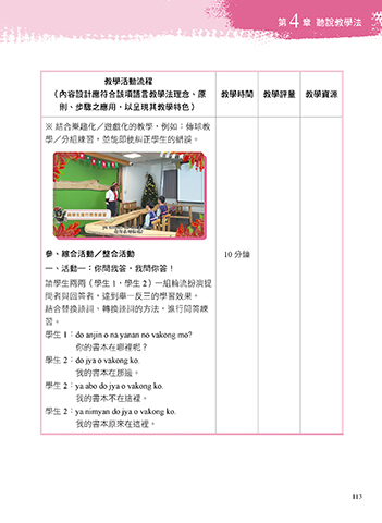 (內容設計應符合該項語言教學法理念、原 教學時間 教學評量 教學資源