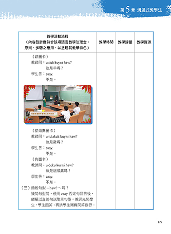 (內容設計應符合該項語言教學法理念、 教學時間 教學評量 教學資源