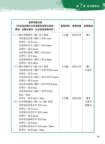 (內容設計應符合該項語言教學法理念、 教學時間 教學評量 教學資源