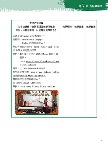 (內容設計應符合該項語言教學法理念、 教學時間 教學評量 教學資源