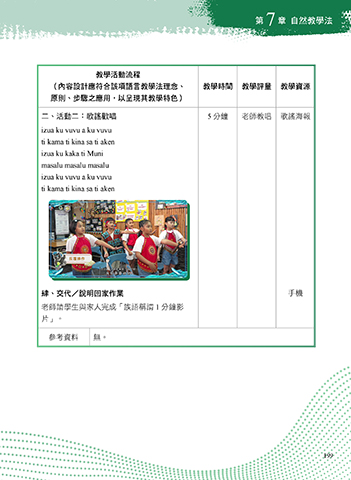 (內容設計應符合該項語言教學法理念、 教學時間 教學評量 教學資源