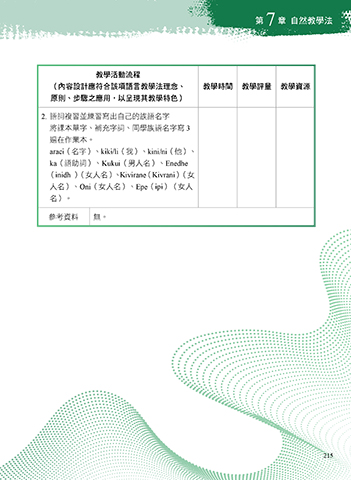 (內容設計應符合該項語言教學法理念、 教學時間 教學評量 教學資源