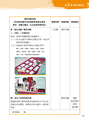 (內容設計應符合該項語言教學法理念、 教學時間 教學評量 教學資源