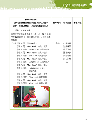 (內容設計應符合該項語言教學法理念、 教學時間 教學評量 教學資源