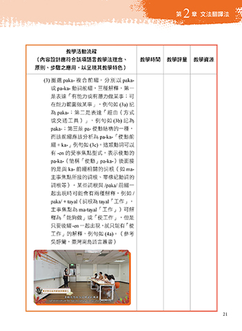 (內容設計應符合該項語言教學法理念、 教學時間 教學評量 教學資源