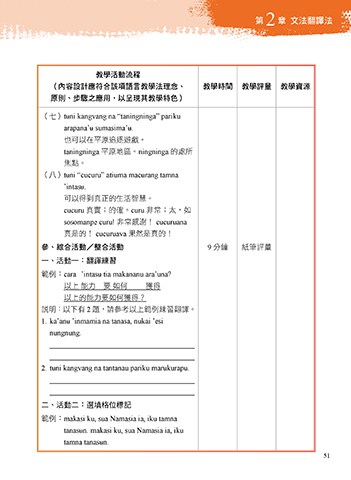 (內容設計應符合該項語言教學法理念、 教學時間 教學評量 教學資源