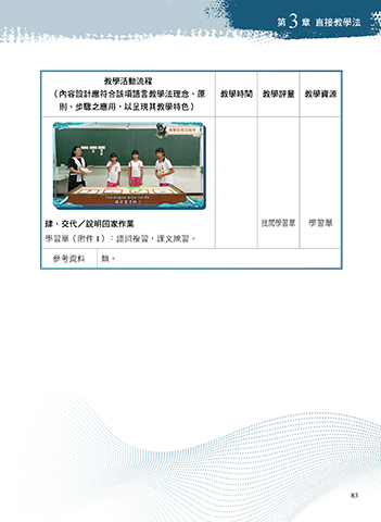 3 第 章 直接教學法 教學活動流程 (內容設計應符合該項語言教學法理念、原 教學時間 教學評量 教學資源 則、步驟之應用,以呈現其教學特色) 肆、交代/說明回家作業 ҭቡኪ୦ఊ ኪ୦ఊ ኪ୦ఊڝ 1jႧ൚ል୦dሙ˖ᇖ୦f ਞϽ༟ࣘ ೌf 83