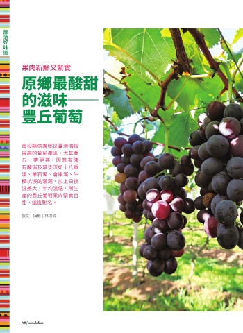 部落好味道 果肉新鮮又緊實 原鄉最酸甜 的滋味── 豐丘葡萄 南投縣信義鄉是臺灣海拔 最高的葡萄產區,尤其豐 丘一帶更甚,因其有陳 有蘭溪及其支流如十八重 溪、筆石溪、倉庫溪、牛 稠坑溪的灌溉,加上日夜 溫差大、年均溫低,所生 產的豐丘葡萄果肉緊實且 甜,遠近馳名。 撰文、攝影|林瑞珠 48 | mainduduaz ɨʹ @ໝλբ༸ JOEE ɨʹ @ໝλբ༸ JOEE