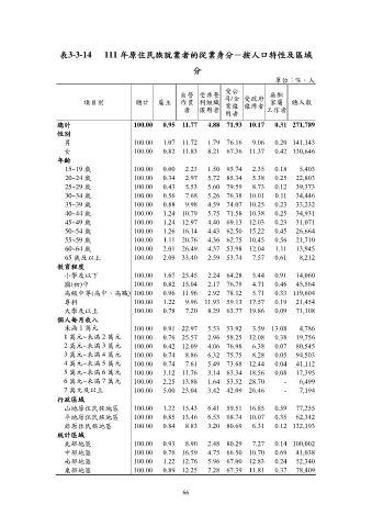 表3-3-14 111 年原住民族就業者的從業身分-按人口特性及區域