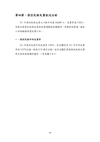 第四節、原住民族失業狀況分析 111 年原住民族失業人口數平均為 10,808 人,失業率為 3.82%。 本節分析原住民族失業者失業週數與求職情形、求職資訊管道、過去 工作經驗與希望從事工作。 一、原住民族平均失業率 111 年原住民族平均失業率 3.82%,和全體民眾 111 年平均失業 率的 3.67%比較,略高 0.15 個百分點,近年全體民眾與原住民族失業 率之間的差距趨於穩定。(參見圖 3-4-1) 104