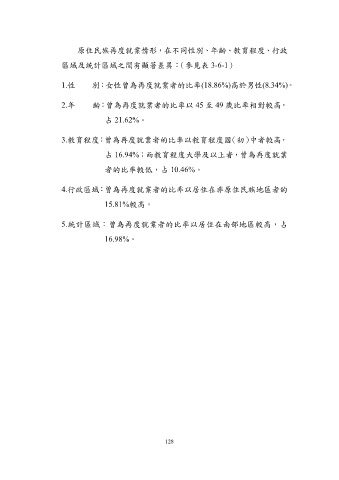 原住民族再度就業情形,在不同性別、年齡、教育程度、行政