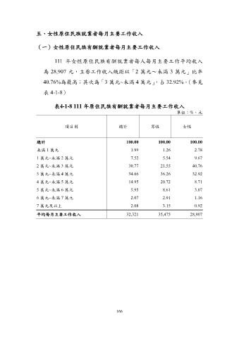 表4-1-8 111 年原住民族有酬就業者每月主要工作收入