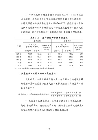 111年原住民族勞動力參與率女男比為0.79,自107年起呈