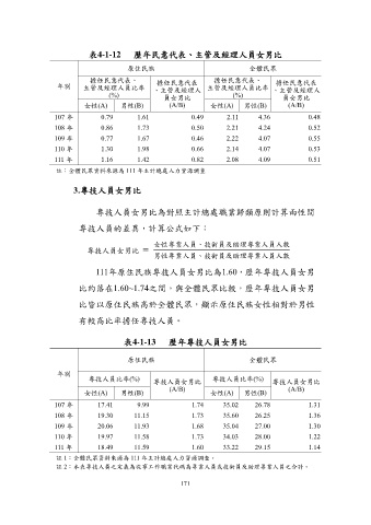 111年原住民族專技人員女男比為1.60,歷年專技人員女男