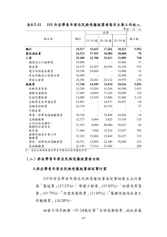 表4-2-11 111 年在學青年原住民族受僱就業者每月主要工作收入