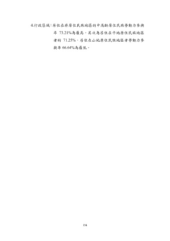 4.行政區域:居住在非原住民族地區的中高齡原住民族勞動力參與 率 73.21%為最高,其次為居住在平地原住民族地區 者的 71.25%,居住在山地原住民族地區者勞動力參 與率 66.64%為最低。 194