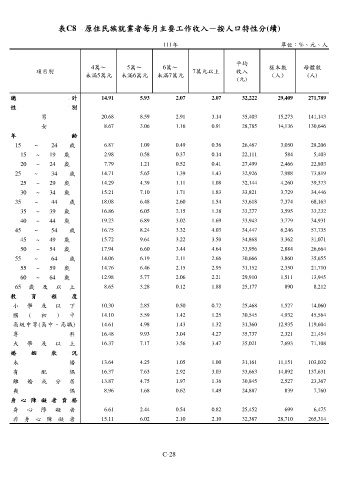 表C8 原住民族就業者每月主要工作收入-按人口特性分(續)